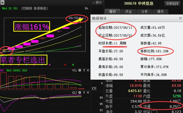 中科信息 300678选股理由:中科信息是凌云8月11号在专栏用方法选出来的,此法比较复杂这里也就不详细说了,想了解的朋友可以去凌云专栏查看。中科信息选出来之后第二天就出现了一个涨停,第三天又是一个涨停,截止目前短短11个交易日,涨幅达到了161%。想学习选强势股和买卖点操作技巧的朋友可加凌云微信:【9281714】,或QQ:9281714,凌云会给大家一一解答。