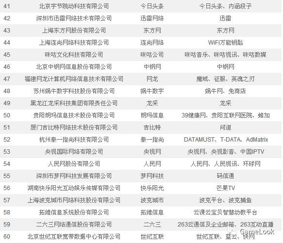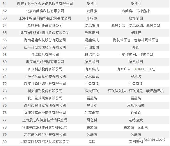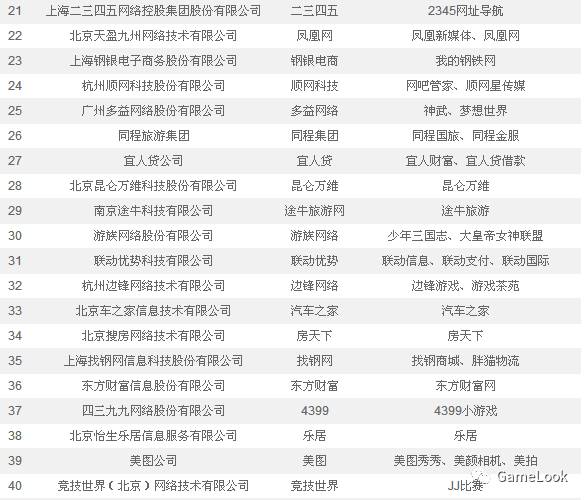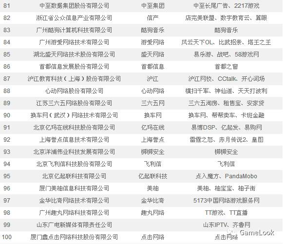 大游戏、巨人网络、完美世界、掌趣、恺英网络、中手游、英雄互娱、乐逗、银汉、乐元素、智明星通、天神互动、IGG、Efun等若干公司,因此该百强榜仅供业界参